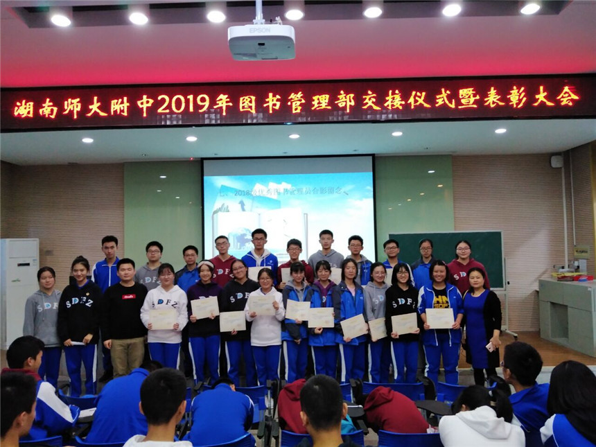 11月15日,2019年图书管理部交接仪式暨表彰大会在图书馆报告厅举行。高一、高二图书管理员代表,18级、19级图书管理部干部,共80余人参加。团委书记李钊出席会议。大会由新任部长陈思佳主持。