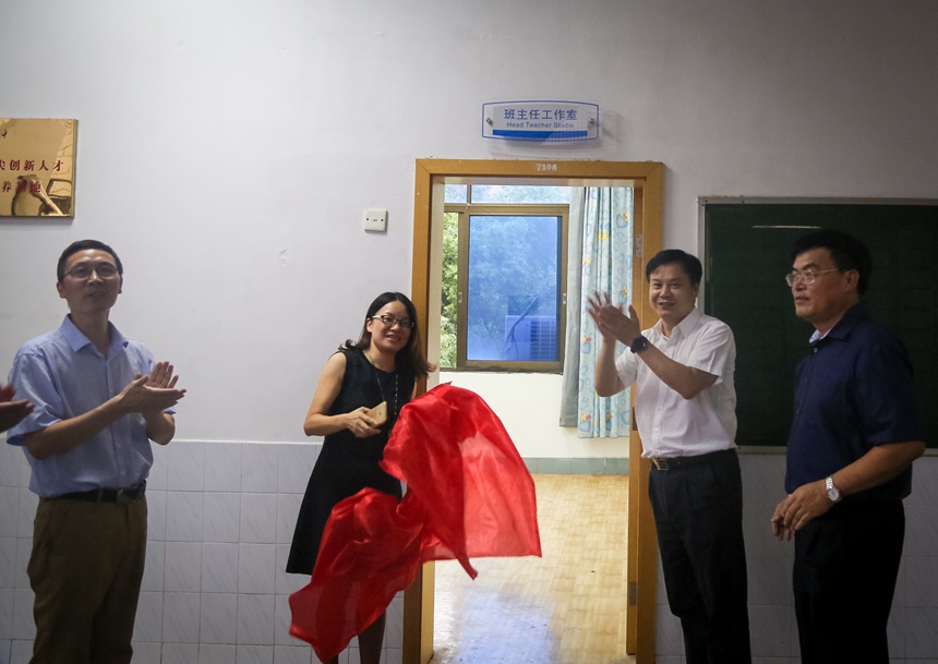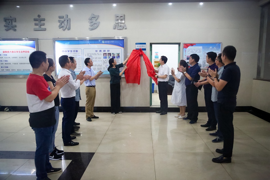 9月19日下午,我校举行“四中心一工作室”揭牌仪式。校长谢永红,副校长黄月初、陈迪勋,学生发展处主任郭在时、副主任吴卿,团委书记李钊,湖南广益实验中学副校长蔡毅、湖南师大附中博才实验中学副校长黄宇鸿、湖南师大附中梅溪湖中学副校长张志、湖南师大附中高新实验中学副校长罗爱斌、湖南师大附中耒阳分校副校长李智敏,“四中心一工作室”负责人、核心成员出席了揭牌仪式。