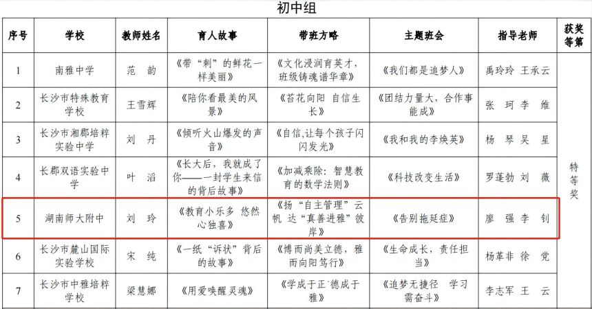 在公布的获奖名单中,我校初中部刘玲老师以《教育小乐多,悠然心独喜》的育人故事、 《扬“自主管理”云帆,达“真善进雅”彼岸》的带班方略以及《告别拖延症》的主题班会夺得初中部特等奖;我校高中部成子通老师以《当“财富”来敲门》的育人故事、《悦纳自己,努力前行,享受高中》的带班方略、《传革命精神,守江河安澜》的主题班会夺得高中部特等奖!