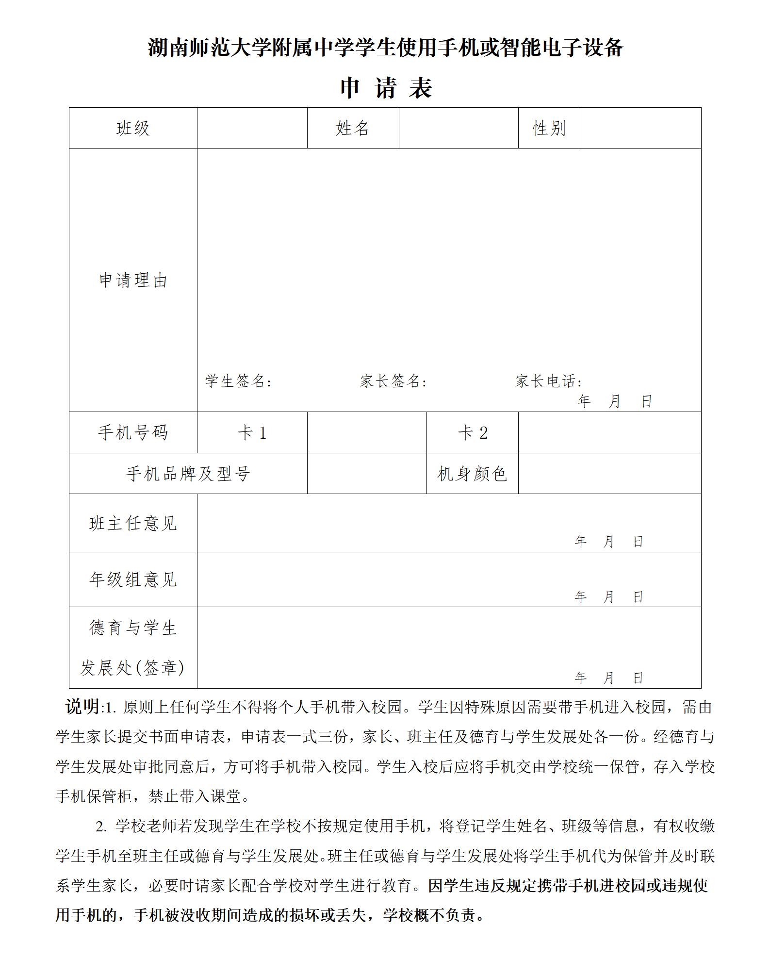 数字校园 办公常用表单 湖南师范大学附属中学学生使用手机或智能电子设备申请表 发布:系统管理员 来源:德育与学生发展处 日期:2023-03-28 人气:分享到: 湖南师范大学附属中学学生使用手机或智能电子设备申请表 上一篇:湖南师大附中查看监控申请表 下一篇:湖南师大附中学生处分撤销申请登记表 通知公告 更多 关于征集湖南师大附中“十五五” 湖南师大附中2026年教师招聘(第 湖南师大附中2025年教育教学成果 湖南师范大学附属中学2025年零星 关于举办第40届校园文化艺术节的 湖南师范大学附属中学2026年教师 最新动态 更多