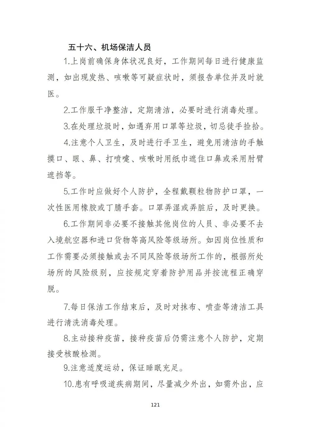 机场保洁人员、境外和境内航班保洁人员和机场司机等是高风险岗位人员,也是近期疫情暴露出的薄弱环节。针对上述问题,本次指南修订从疫苗接种、核酸检测和个人防护等方面提出更加严格的防疫措施,具体包括:一是主动接种疫苗,定期接受核酸检测。二是工作期间非必要不接触其他岗位的人员、非必要不去入境航空器和进口货物等高风险等级场所。三是清洁消毒过程中应按照相应规范、指南使用合适的消毒剂以确保消毒效果有效。四是保障入境航班的保洁人员和司机岗位和休息区域等应固定,避免混用和混流。五是入境航班或国内航班始发地所在城市存在中、高风险地区的保洁人员收集的垃圾、废物应按相关规定统一处理。