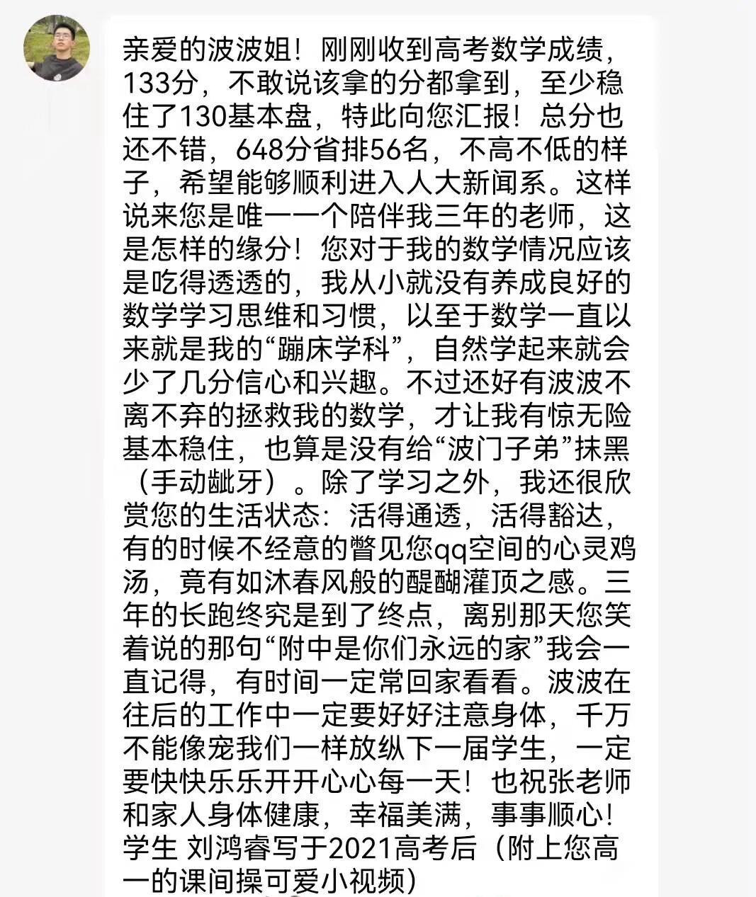 2018级文科班校友刘鸿睿、侯依阳告诉小编老师,“在我们和数学纠缠不休、斗智斗勇的时候,波波姐(张汝波老师)似乎就是上天派来拯救我们这群‘数盲’的。”