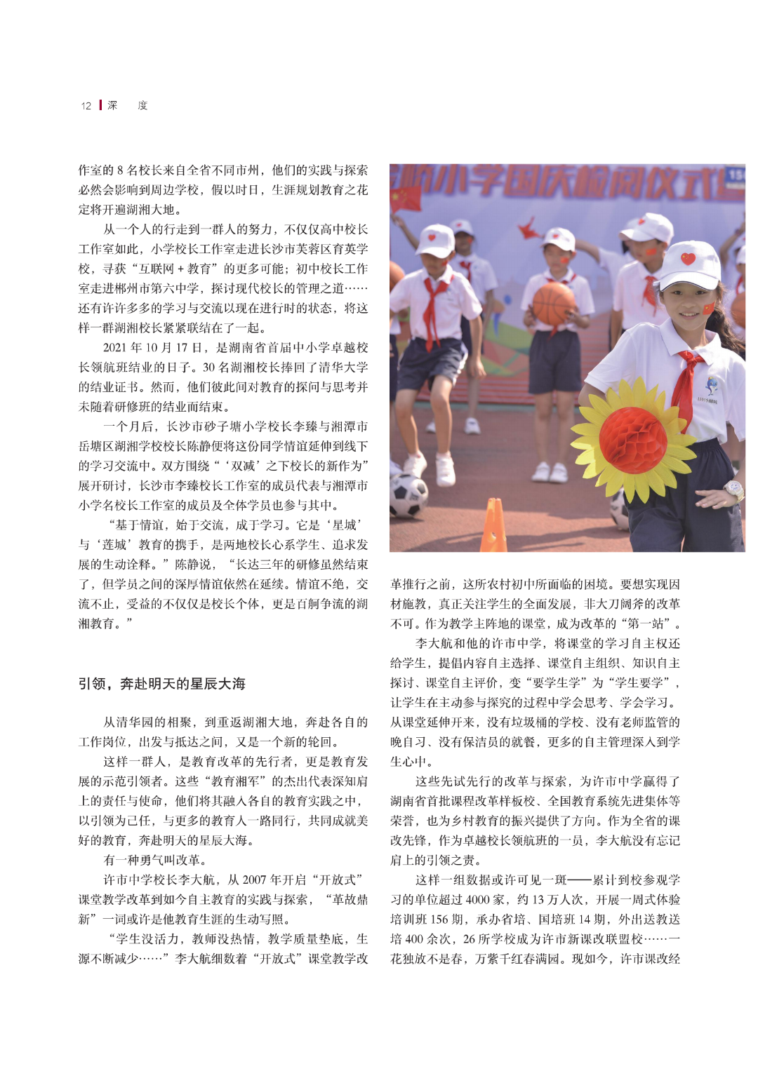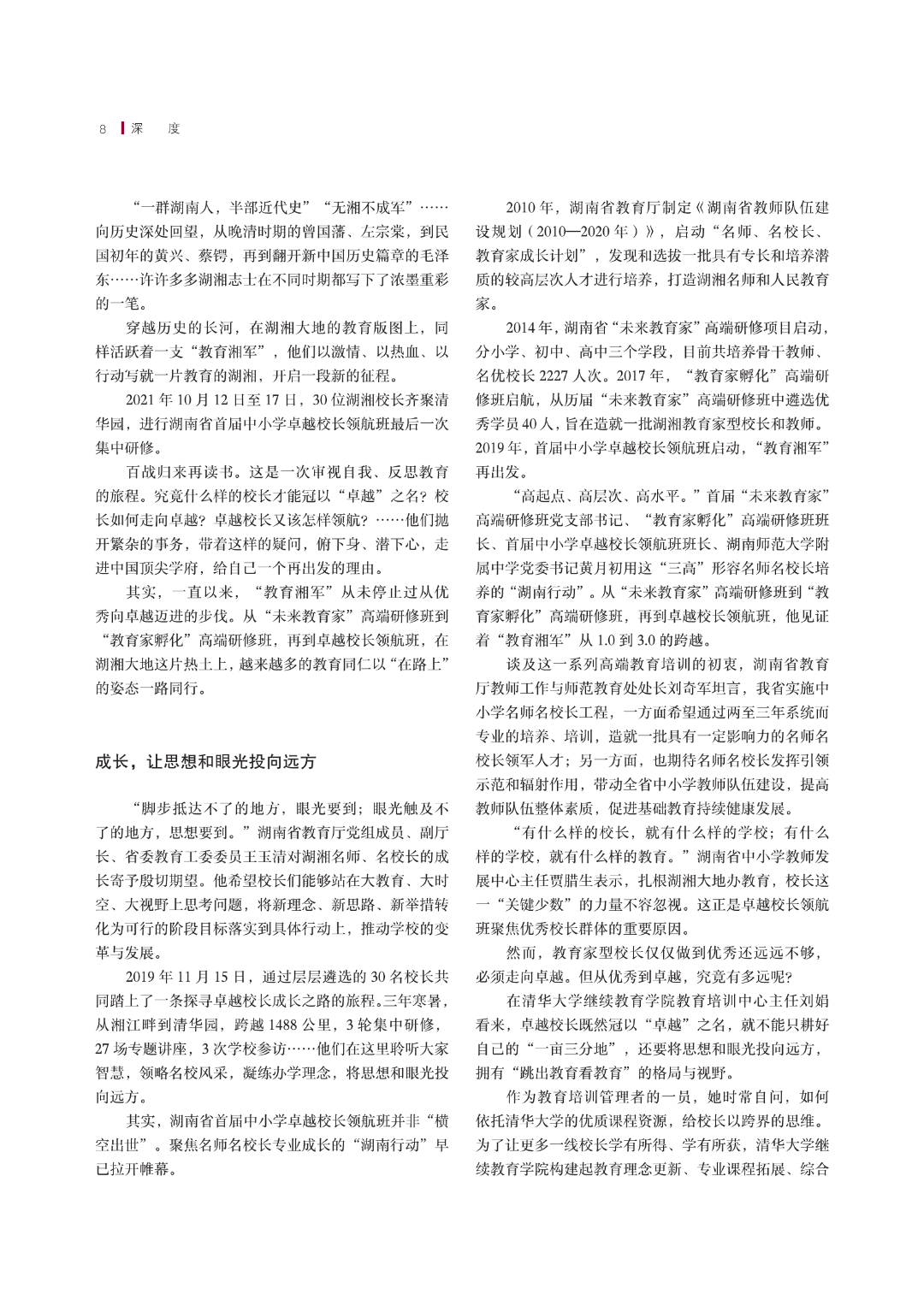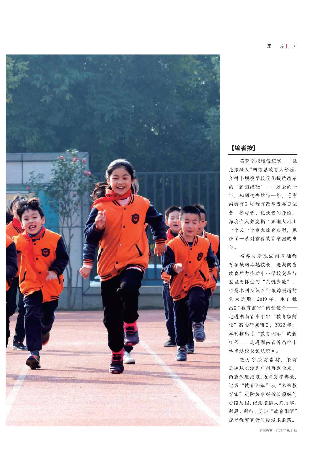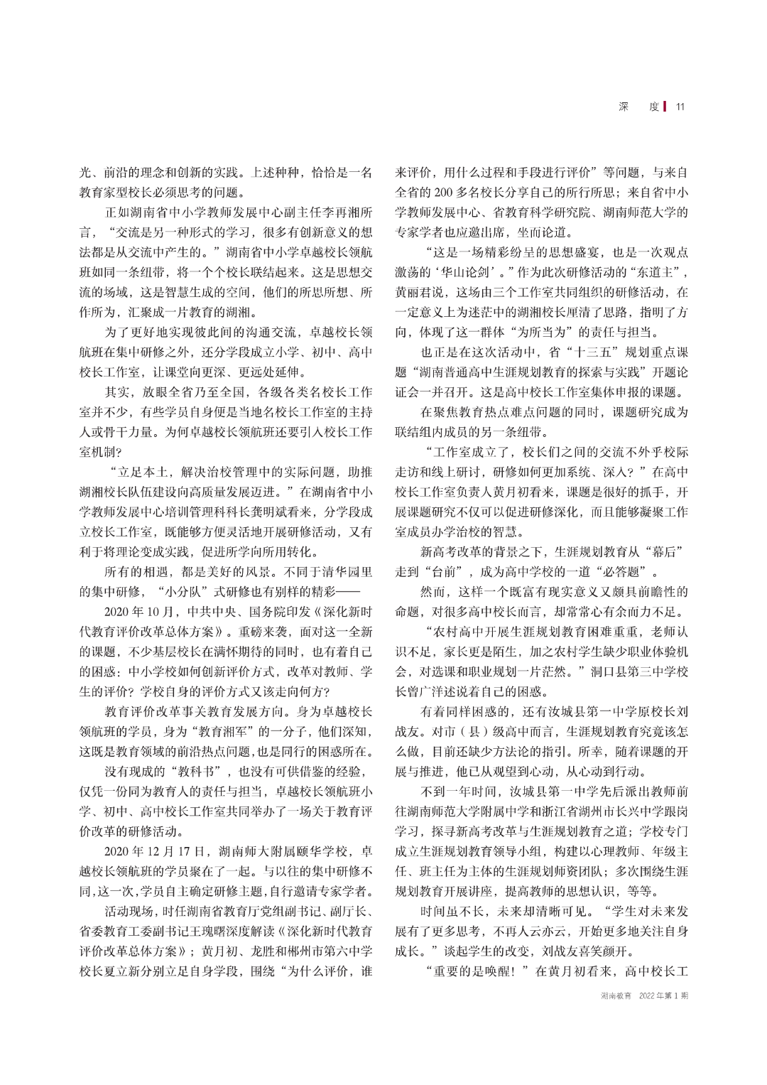 培养与造就基础教育领域的卓越校长,是湖南省教育厅为推动中小学校变革与发展而抓住的“关键少数”,也是《湖南教育》杂志关注的重大选题。《湖南教育》2022年开年第一期头版头条聚焦此次湖南省中小学卓越校长领航研修班,深度报道了“教育湘军”从“未来教育家”进阶为卓越校长领航的心路历程,记录这群人的所学、 所思、所行,见证“教育湘军” 探寻教育真谛的漫漫求索路。