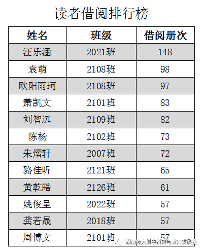 高2021班汪乐涵同学创下全学年借阅图书148册次的纪录。下述12位同学借阅量名列前茅,是本学年度当之无愧的阅读之星。