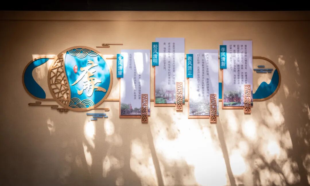 廊道两侧的文化墙呈现了清廉校园建设的目标规划、对教职工的纪律要求、廉洁人物等多个板块。
