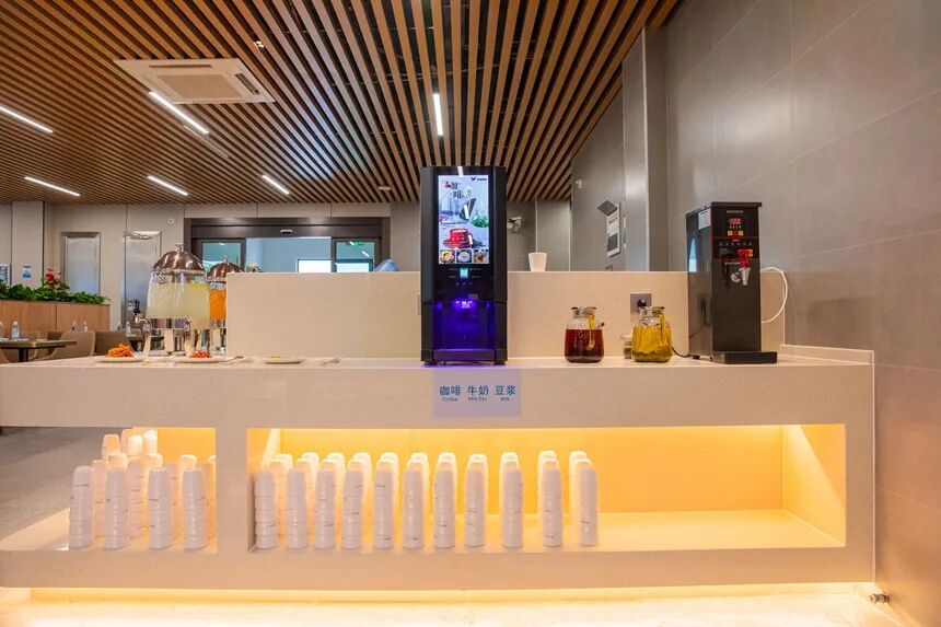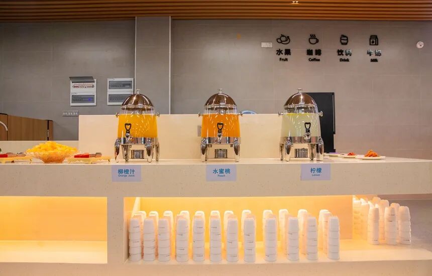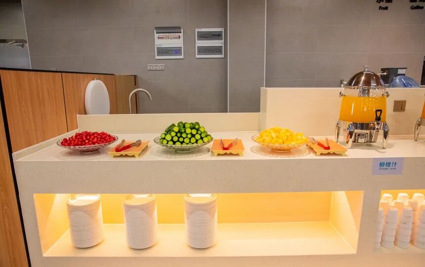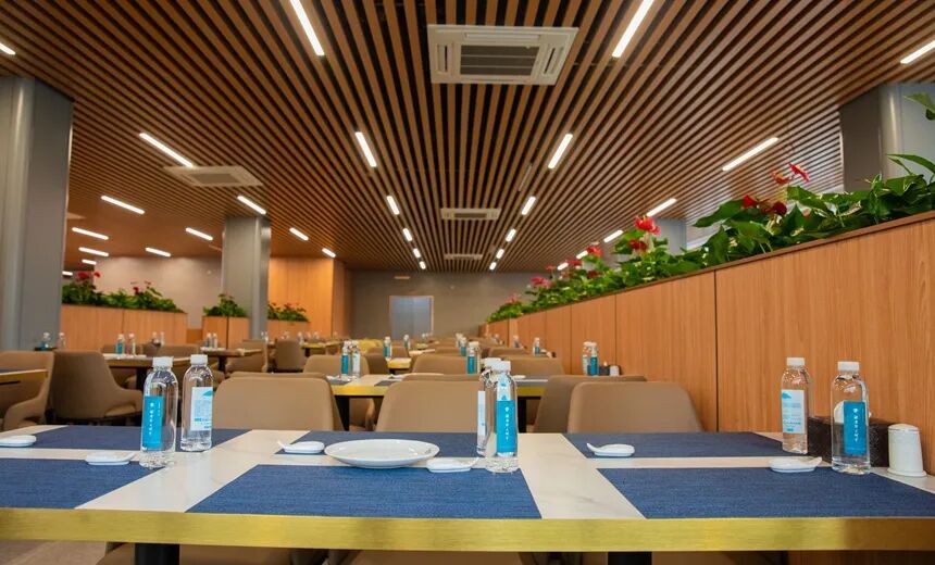 在湖南师大附中小桃园食堂三楼教职工餐厅,整齐的桌椅、洁净的餐垫、新鲜的水果、丰富的饮料一早就准备完成,等待着开业的第一批客人。