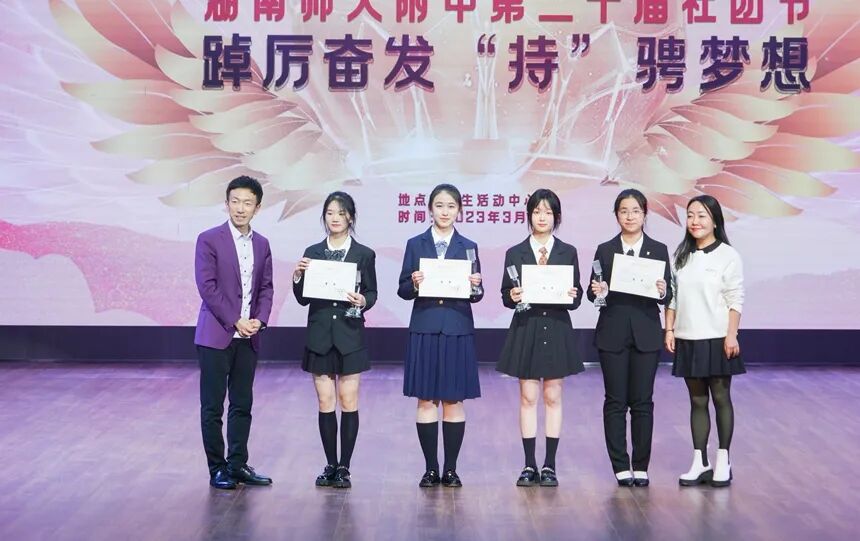 3月22日晚,湖南师大附中举行第七届“踔厉奋发 持骋梦想”主持人大赛。中国播音主持界最高奖“金话筒”奖获得者、著名主持人丹阳,首届中国播音主持金声奖得主、《国生开讲》栏目主持人国生,德育与学生发展处主任李钊、体育美育中心主任谭伟、政治教研组副组长杨玉茜、语文教研组副组长李显亮、艺术教研组组长李鹏程担任评委。比赛由播音主持协会梁博涵、刘鹏熙蕊同学主持。