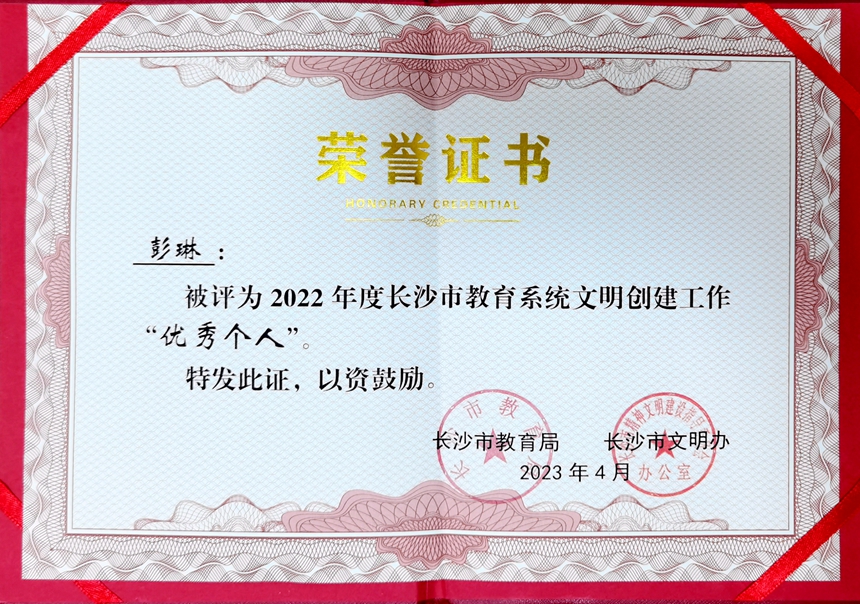 近日,长沙市教育局公布《2022年度长沙市教育系统文明创建工作先进集体和优秀个人评选结果通报》,我校获评2022年度文明创建工作“先进集体”,后勤服务和安全保卫中心彭琳获评2022年度明创建工作“先进个人”。