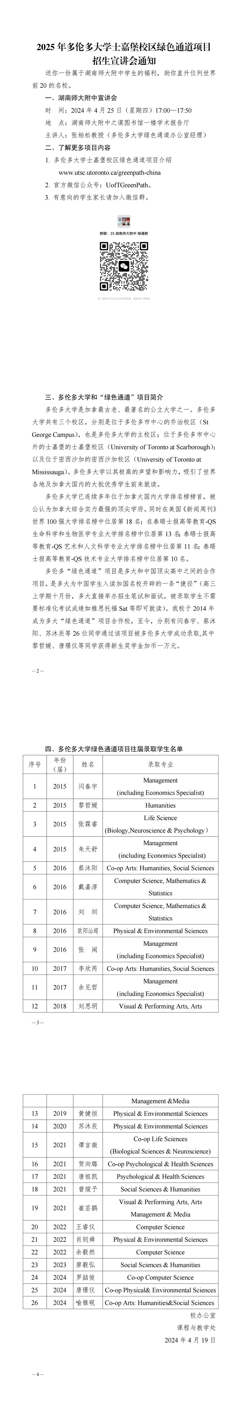 新闻中心 附中新闻 通知公告 最新动态 教育视点 集团学校新闻联播 媒体聚焦 工作安排 微信附中 2025年多伦多大学士嘉堡校区绿色通道项目招生宣讲会通知 发布:系统管理员 来源:未知 日期:2024-04-19 人气:分享到: 上一篇:关于动员有关人员参加全国社会工作者职业资格考试的通知 下一篇:2024年劳动节放假通知 通知公告 更多 关于做好政工专业知识考试工作的 2026年多伦多大学士嘉堡校区绿色 2025年清明节放假通知 湖南师范大学附属中学2025年公开 湖南省教育厅关于做好湖南省教育 关于举办第二十二届学生社团节的 最新动态 更多