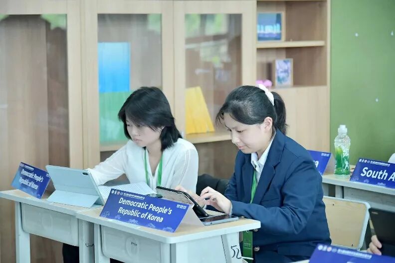 尹芙希同学来自联合国教科文组织(UNESCO)。UNESCO以英文为工作语言,以“规范GenAI(生成式人工智能)在教育领域的应用”为议题,与32个参会国代表共同商议。尹芙希同学作为中国代表,为维护本国利益,为解决问题提供中国方案,贡献中国智慧,促进GenAI时代下全球教育的共同发展,深入思考,积极发言,提出动议,并针对其他国家代表提供的动议可改进之处积极提出修正案。其提出的动议包括解决GenAI(生成式人工智能)中存在的文化偏见和数据不均的问题、促进GenAI(生成式人工智能)与传统教育的平衡发展,如上动议均获得通过。同时,对于韩国代表、墨西哥代表以及美国代表的动议,积极提出修正案,使动议更加完善,更好地践行“中国构建人类命运共同体”的诺言。