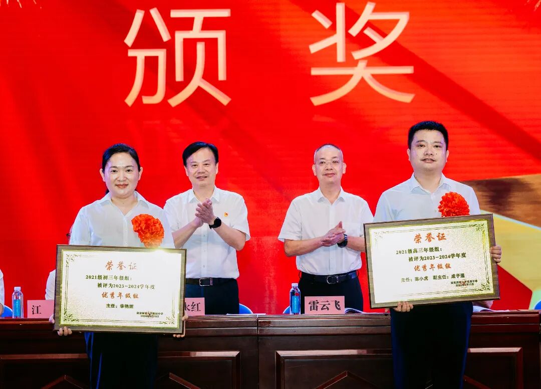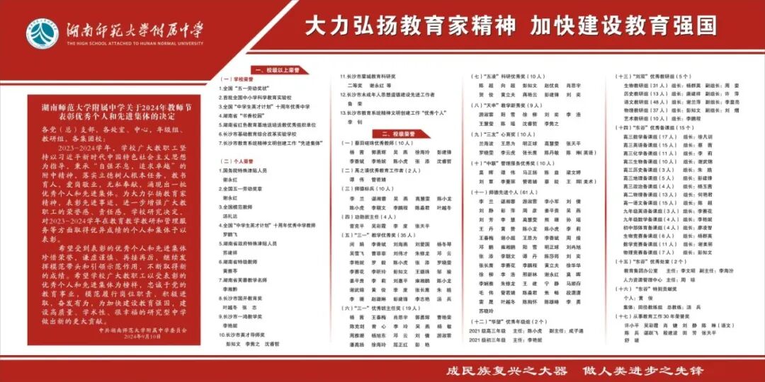 副校长苏建祥宣读了过去一年学校所获荣誉及表彰名单。在过去一年学校先后获全国“五一劳动奖状”、首批全国中小学科学教育实验校、全国“中学生英才计划”十周年优秀中学、湖南省“书香校园”、湖南省红色教育基地送培送教优秀组织单位、长沙市基础教育综合改革实验学校、长沙市教育系统精神文明创建工作“先进集体”等七项重大荣誉。