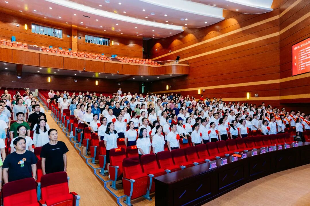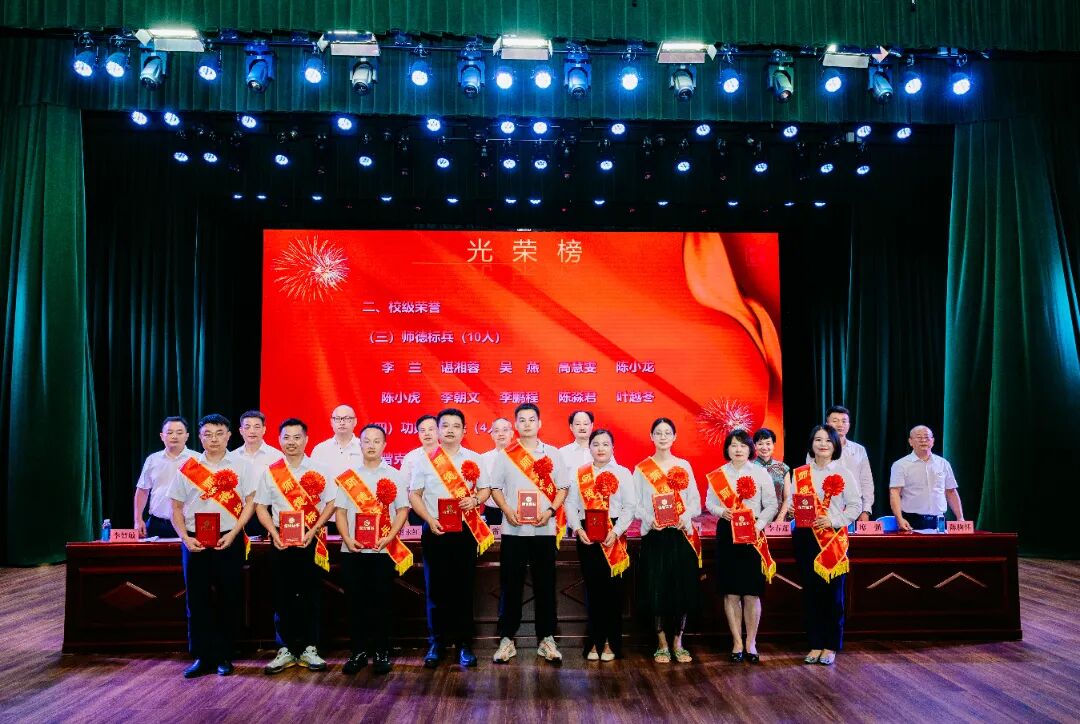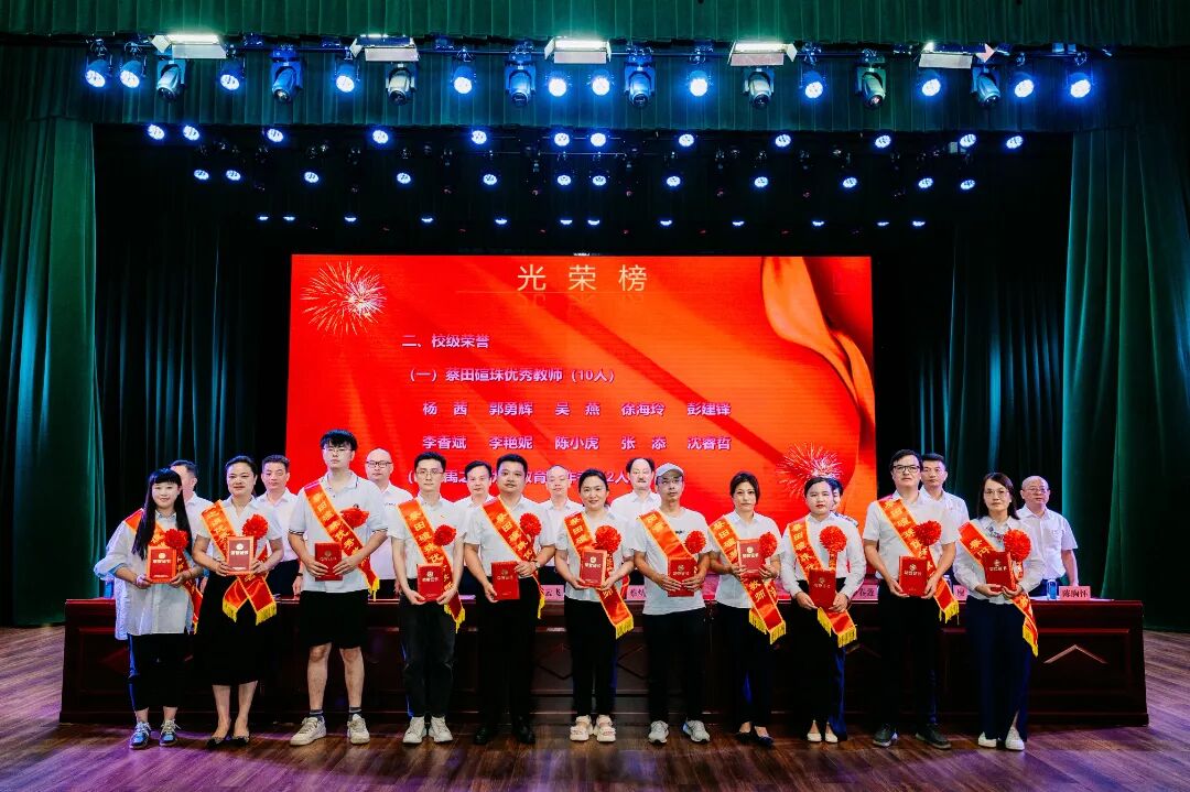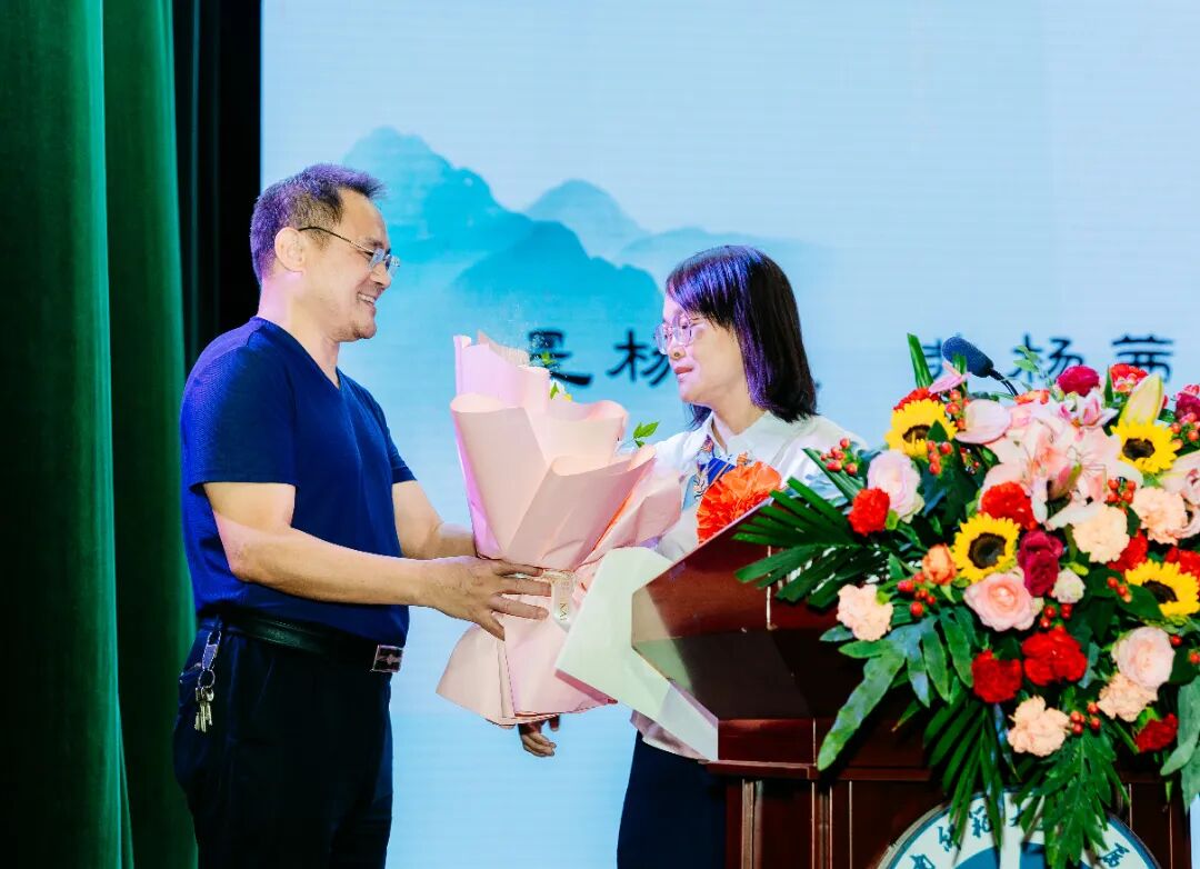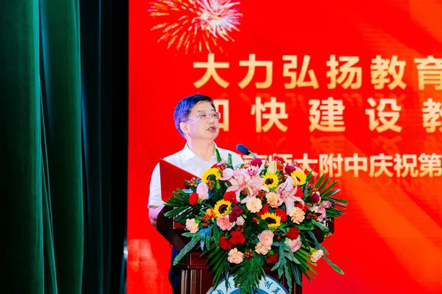 党委书记谢永红致辞。他以《弘扬教育家精神 勇担教育强国使命》为题,向全体教职工致以节日的问候,对获奖集体和个人表示热烈祝贺。然后,他联系附中“慎选良师,精育名师”的优良传统,语重心长地谈起每个教育家的成长之路。他说每一个教育家的成长之路都是漫长的、动态的、艰辛的,而且贯穿整个职业生涯和人生历程,并强调,教育家的成长由低到高大致要经历自然境界、功利境界、道德境界和天地境界四重境界,并号召全体教师通过学习、研究、探索走出“高原”,战胜“大敌”,突破发展瓶颈,创立独特风格,从优秀走向卓越。讲话中,他特别表扬了在第33届全国中学生生物竞赛取得优异成绩的生物教练黄俊老师,并号召全校教职员工向黄俊老师学习。