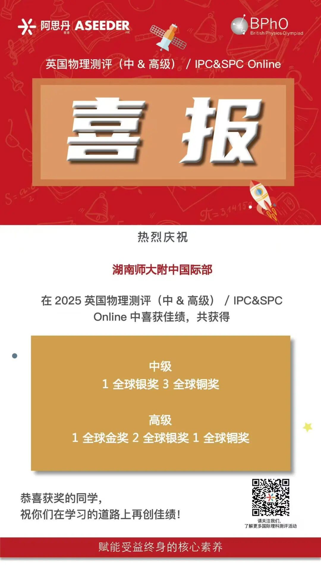他们的优异成绩不仅为个人赢得了荣誉,更为湖南师大附中国际部增添了光彩。这些辉煌成绩的取得,是同学们智慧与汗水的结晶,也是我校国际部教育成果的又一有力证明。我们期待所有同学在未来的学习旅程中,继续发扬探索精神,勇攀学术高峰,创造更多属于自己的辉煌篇章!再次恭喜所有获奖的同学,愿你们在物理的世界里遨游得更远,成就更加璀璨的未来!