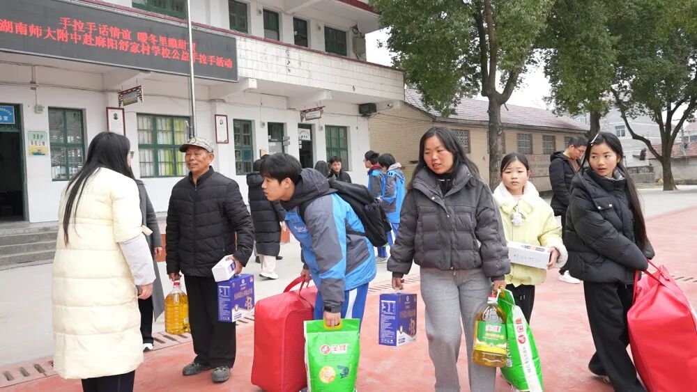 2月2日至3日,德育与学生处主任蔡毅带领23名学生及7名家长代表,驱车数百公里奔赴湖南省怀化市麻阳苗族自治县舒家村学校。地处武陵山片区的舒家村学校留守儿童比例较高,当载满爱心物资的车辆抵达校园时,孩子们眼中满是期待。