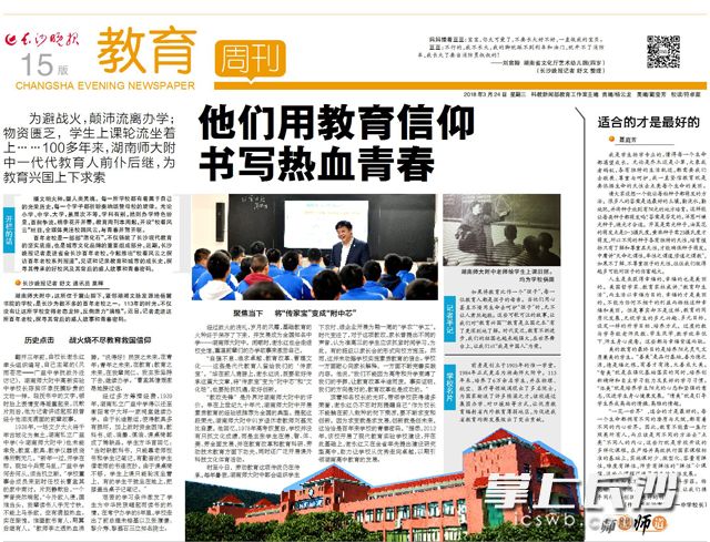 湖南师大附中,有着百年历史的三湘名校,在她走过的百年征程中,湖湘教育的担当底色浸染在每一代附中人生命之中,从晚晴建创校培养辛亥志士,到反袁复辟北上护法,从辗转办学坚持抗战,到走上街头迎接黎明,从私立改公培养建设人才,到教育创新引领湖湘教育,一直走在为民族复兴的担当路上,延续着这个城市的文脉。