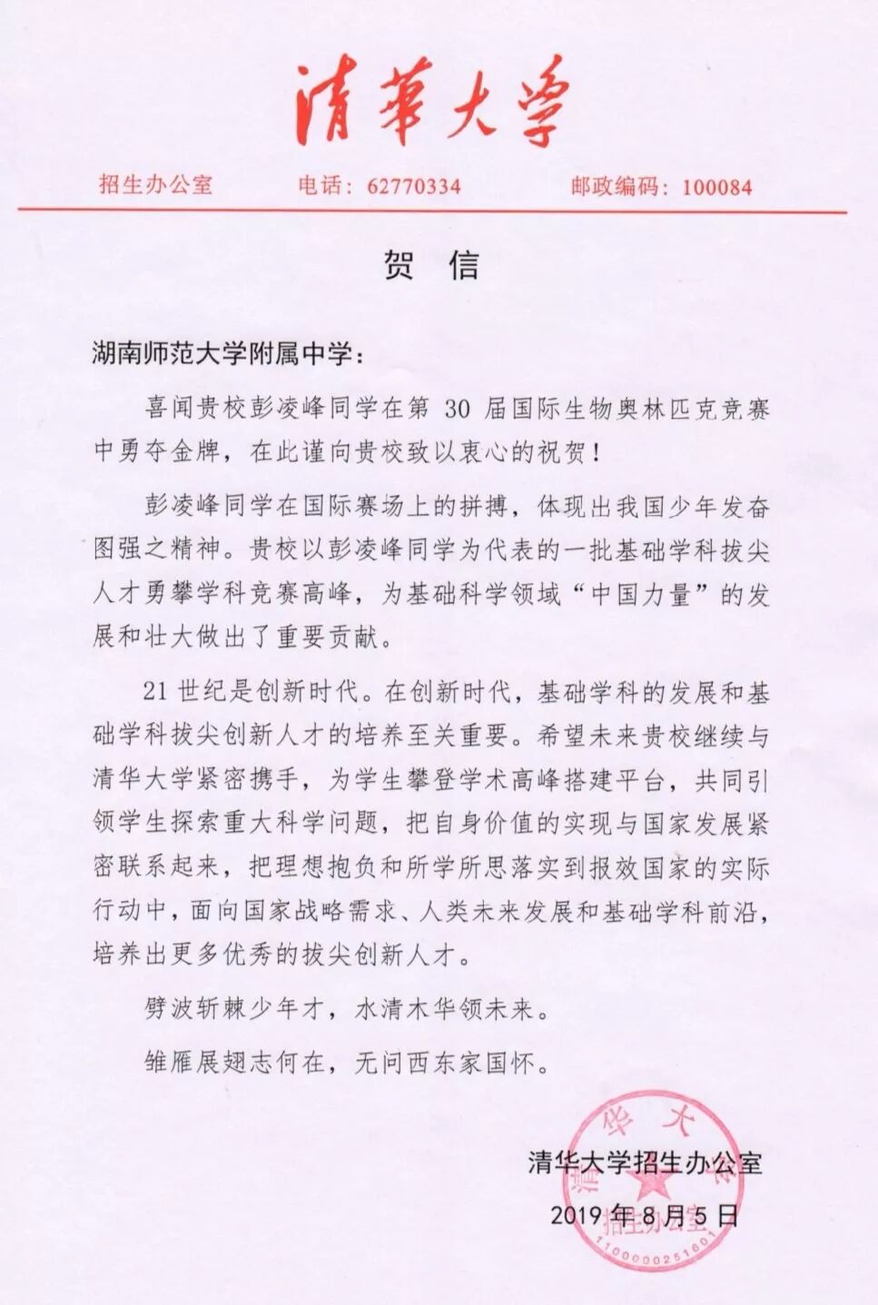 8月5日,清华大学给湖南师大附中发来两封贺信,热烈祝贺附中陈俊豪同学荣获第50届国际物理奥赛金牌、彭凌峰同学以世界第一的成绩勇夺第30届国际生物奥赛金牌,高度肯定附中为基础科学领域“中国力量”的发展和壮大做出的重要贡献。全文转载如下: