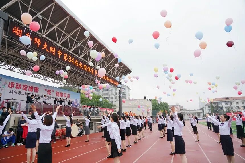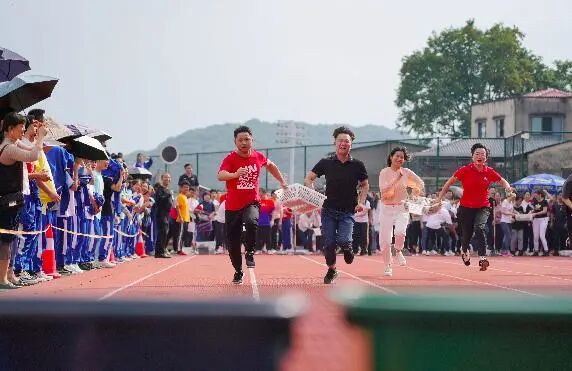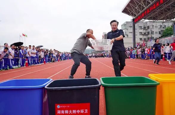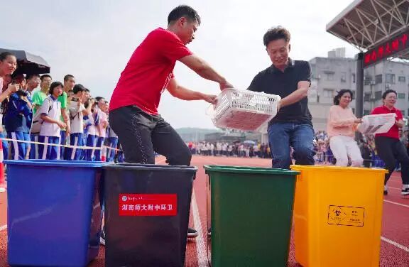 第 34 届校园体育节暨 2020 年田径运动会上,教师们身穿文化衫,全力奔跑,在蓝、绿、黄、黑四色垃圾桶前飞快地完成垃圾分类,将事先准备的垃圾放在相应的垃圾桶中,生怕有一丝丝差错。每当垃圾正确进入 " 归宿 " 时,全场都爆发出热烈的喝彩声。湖南师大附中校长谢永红也在赛场上奋力奔跑,快速完成了一次正确的分类。场外的学生观众们饶有兴趣地 " 围观 " 了老师们这场特别的运动会。