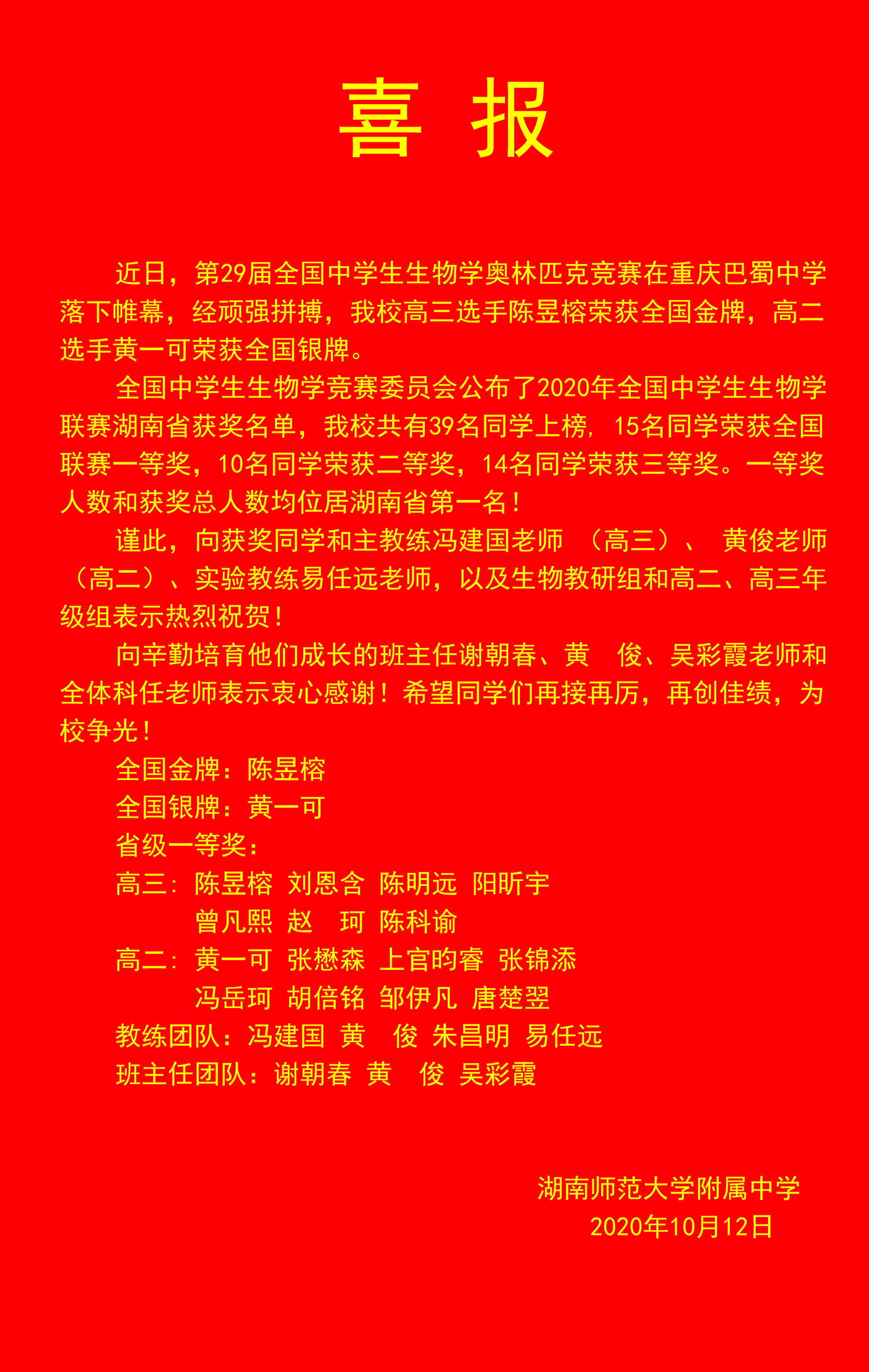 喜报:我校学子在第29届全国中学生生物学奥林匹克竞赛中摘金夺银