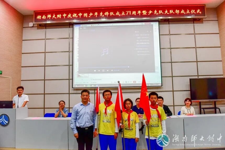 仪式在《中国少年先锋队队歌》中开始,少先队员们全体起立迎接星星火炬旗帜进场。随后,四名少先队员代表献辞,他们一同发出号召:“让我们在附中这亩育人田里追求卓越,长成中华民族的参天大树。”
