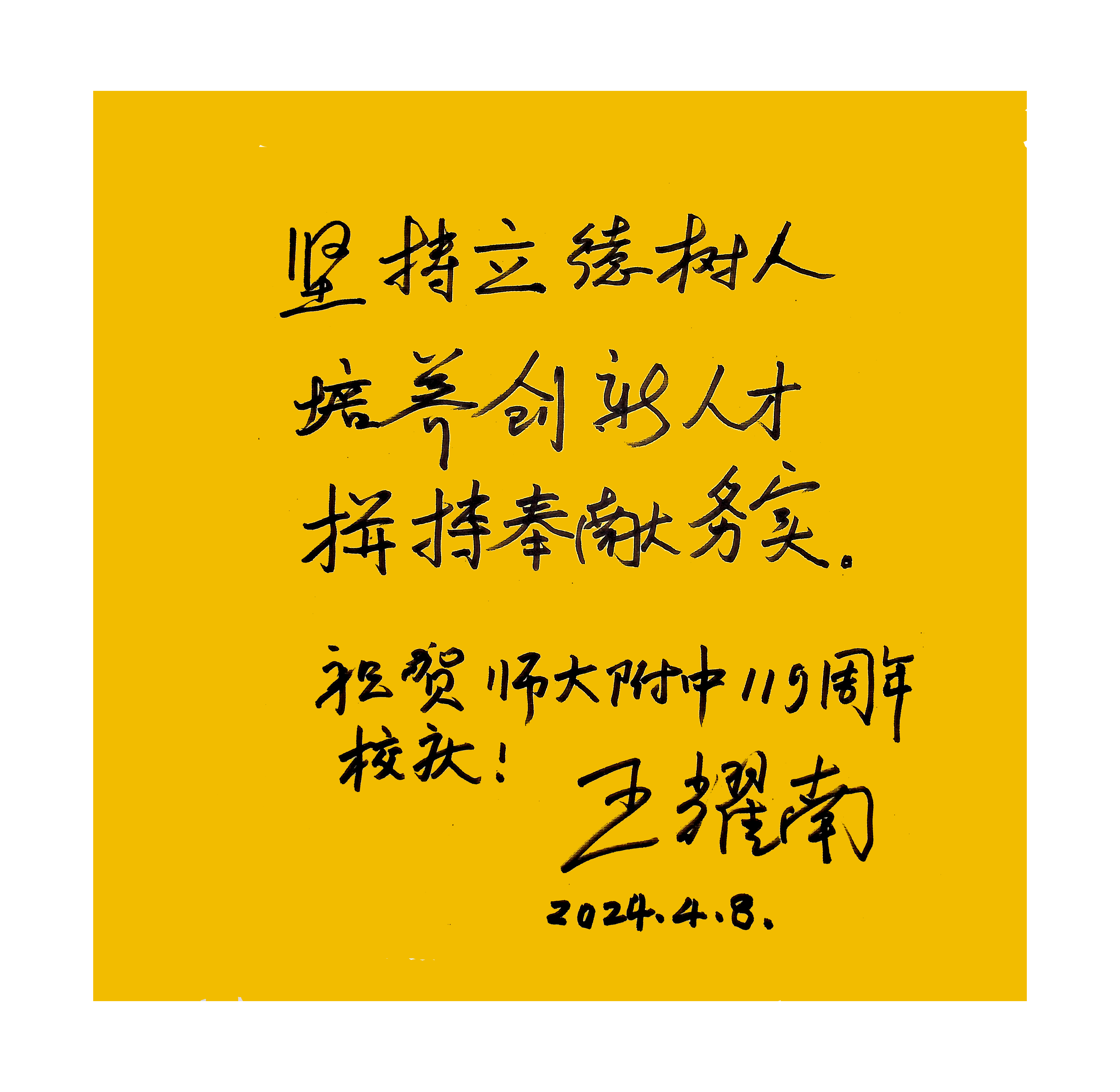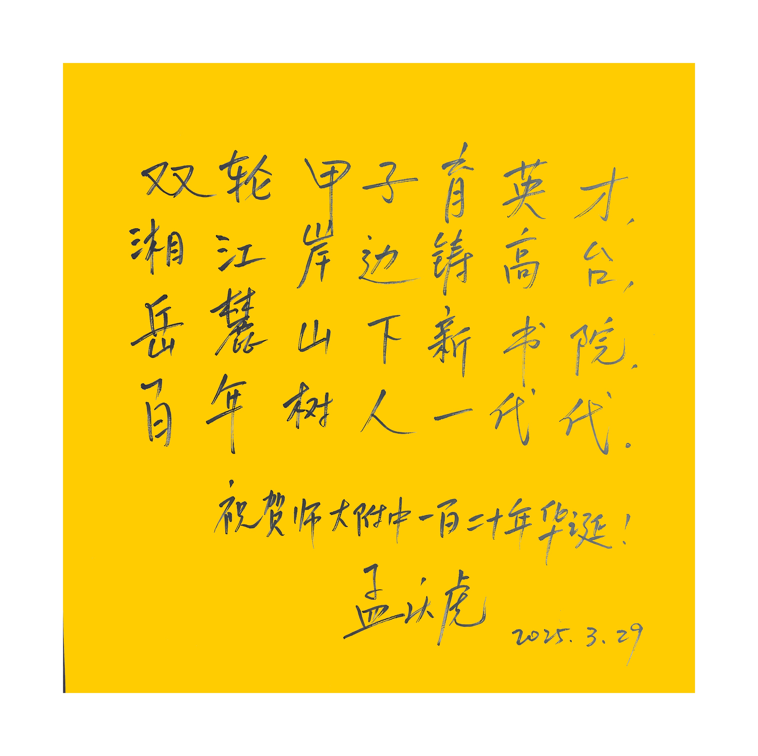 校庆专栏 校庆公告 校庆活动 庆贺集萃 媒体报道 联系我们 贤达墨宝 发布:学校办公室 来源:未知 日期:2025-03-31 人气:分享到: 解放军国防科工委副主任张学东将军题词 雷达与电子技术专家、中国工程院院士张履谦教授题词 神舟十八号乘组指令长、国家二级功勋航天英雄叶光富大校通过校友杨玄典老师,向湖南师大附中转赠签名纪念章并祝贺学校建校120周年华诞,希望以此激励附中学子努力学习,荣校报国! 中国工程院院士,冶金环境工程专家柴立元教授题词 欧洲科学院院士,华南理工大学计算机科学与工程学院院长陈俊龙教授题词 中国科学院院士,浙江大学物理系教授,理论物理学家罗兴民教授题词 中国工程院院士、哈尔滨工业大学教授、博导马军教授题词 全国政协委员、湖南省作家协会主席、著名儿童文学作家、湖南师范大学汤素兰教授题词 湖南大学教授,中国工程院院士,机器人视觉感知与控制技术国家工程研究中心主任王耀南教授题词 中国遗传学会理事长、中国科学院院士杨维才教授题词 中国工程院院士、中国科学院亚热带农业生态研究所研究员印遇龙教授题词 中国科学院院士、中国科学院化学研究所研究员李永舫教授题词 人工智能专家,加拿大工程院院士,香港工程师学院院士孟庆虎教授题词 著名主持人、资深媒体人、企业家、慈善家杨澜女士题词 中国科学院院士、中国科学院化学研究所研究员李永舫教授题词 上一篇:高校翰情 下一篇:协作贺章 通知公告 更多 2025年劳动节放假通知 关于做好政工专业知识考试工作的 2026年多伦多大学士嘉堡校区绿色 2025年清明节放假通知 湖南师范大学附属中学2025年公开 湖南省教育厅关于做好湖南省教育 最新动态 更多